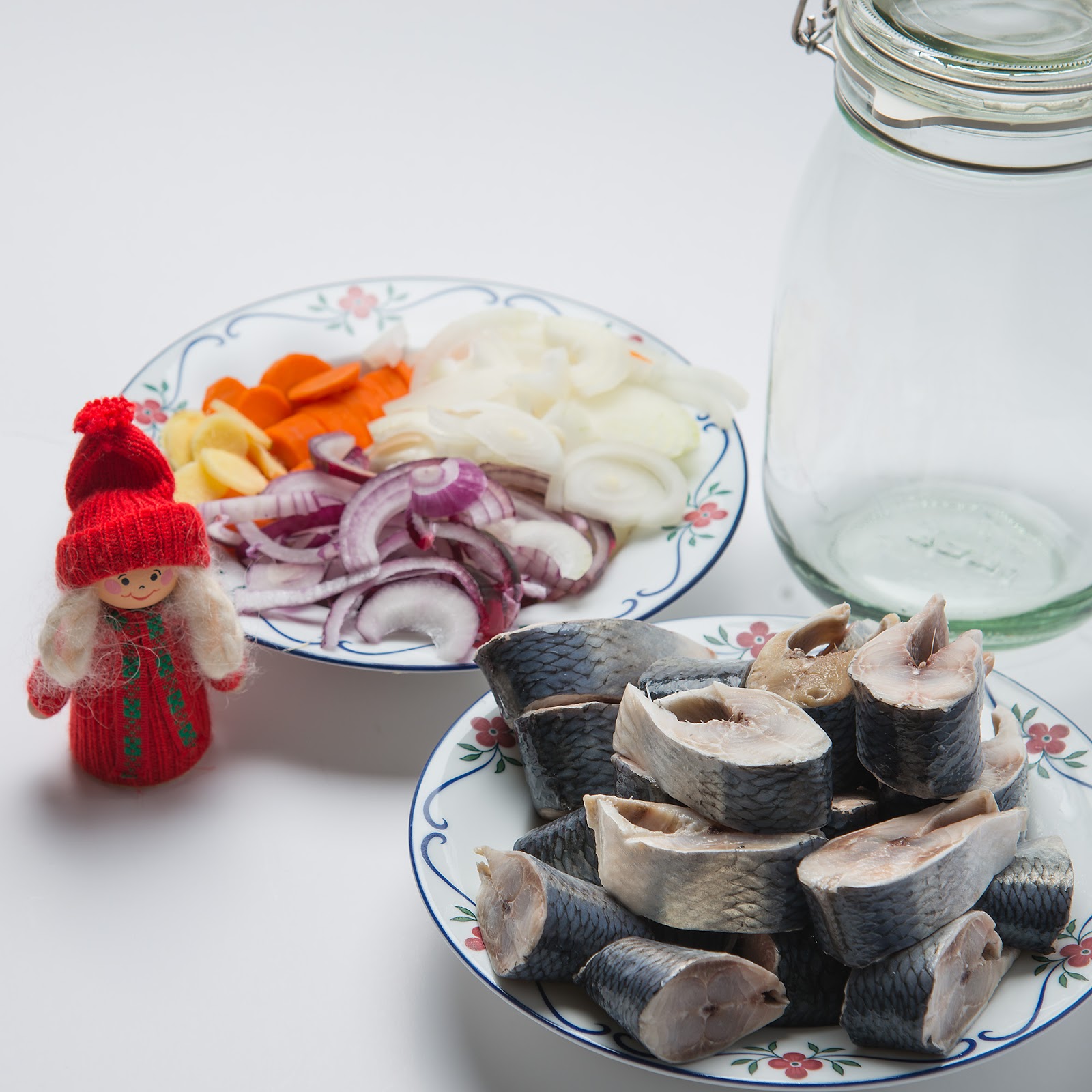 Jag befinner mig nu på dag 3 i receptet nedan. De feta sillarna har vattnats ur i två dygn och nu är det dags att lägga dessa i glasburk med lök, morot och färsk ingefära.