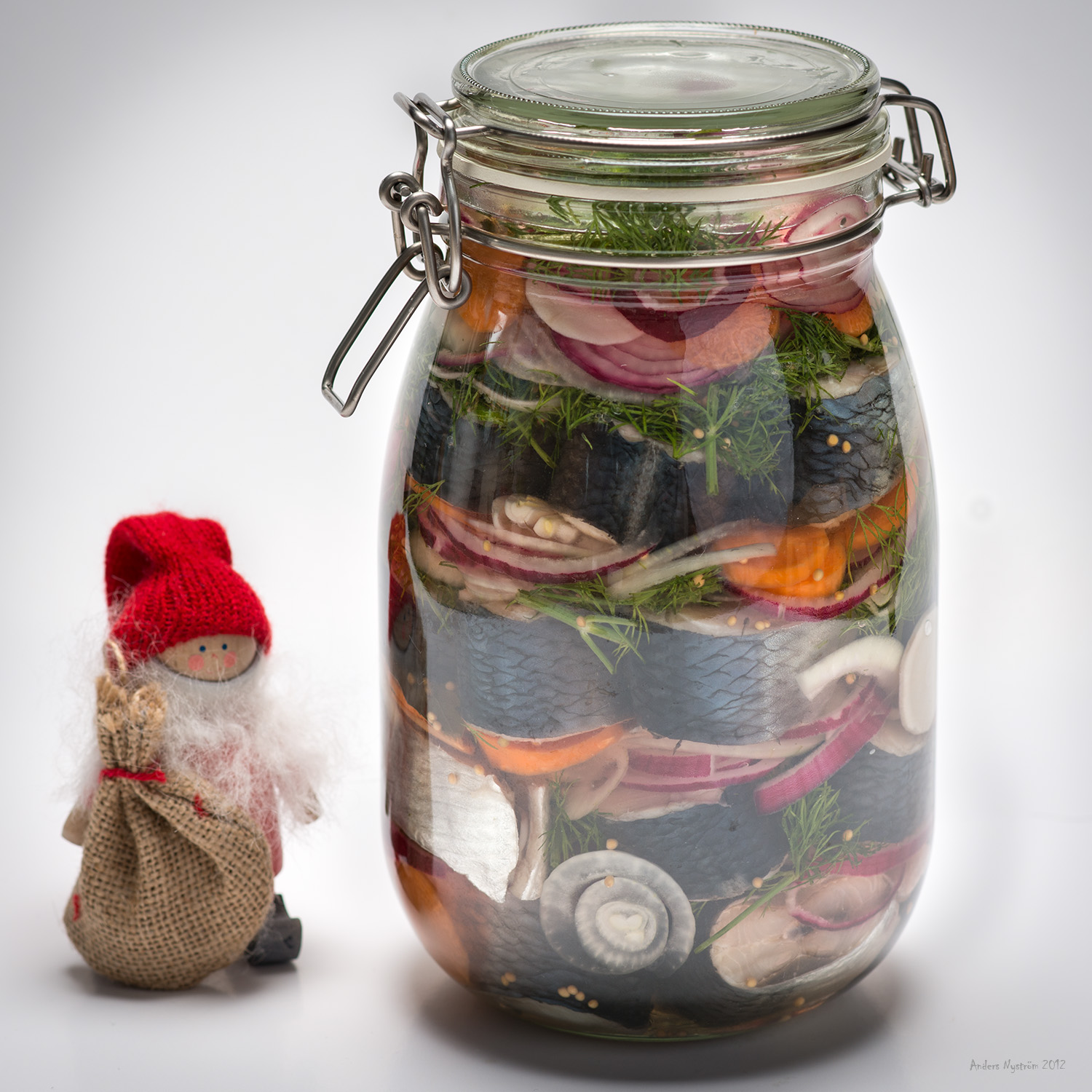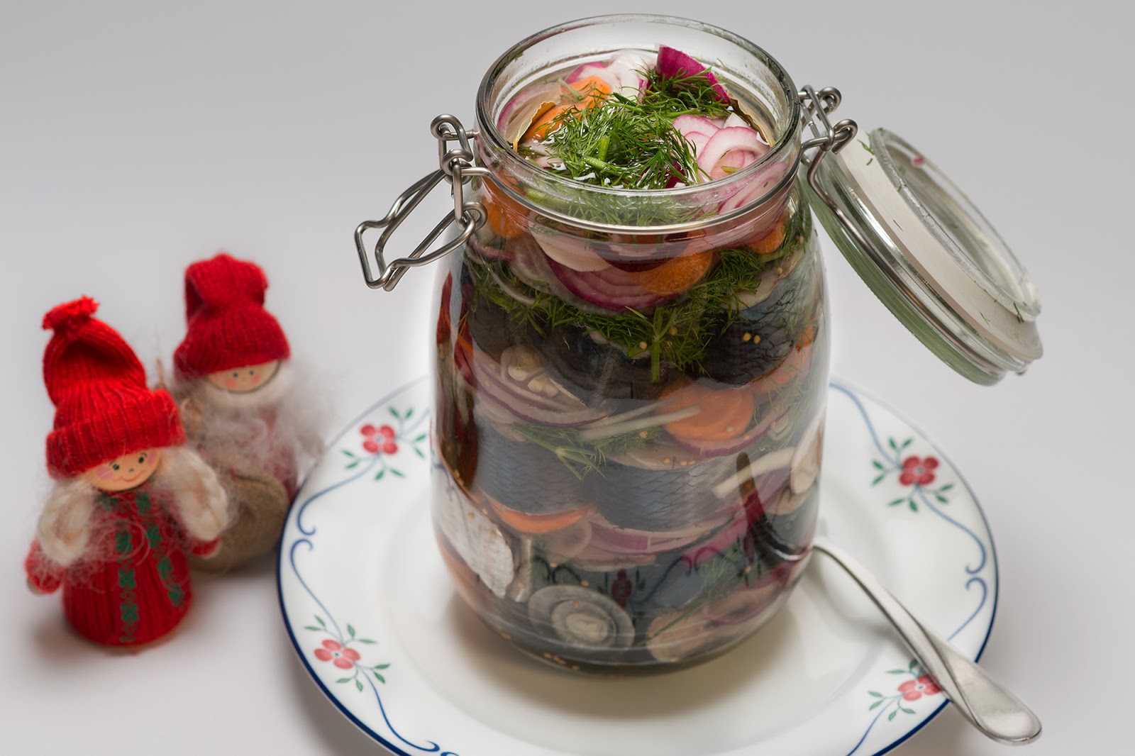 Efter att ha varvat sill och tillbehör i en glasburk blev resultatet ganska bra.... Nu ska det stå så här och dra, utan lag, över natten.
